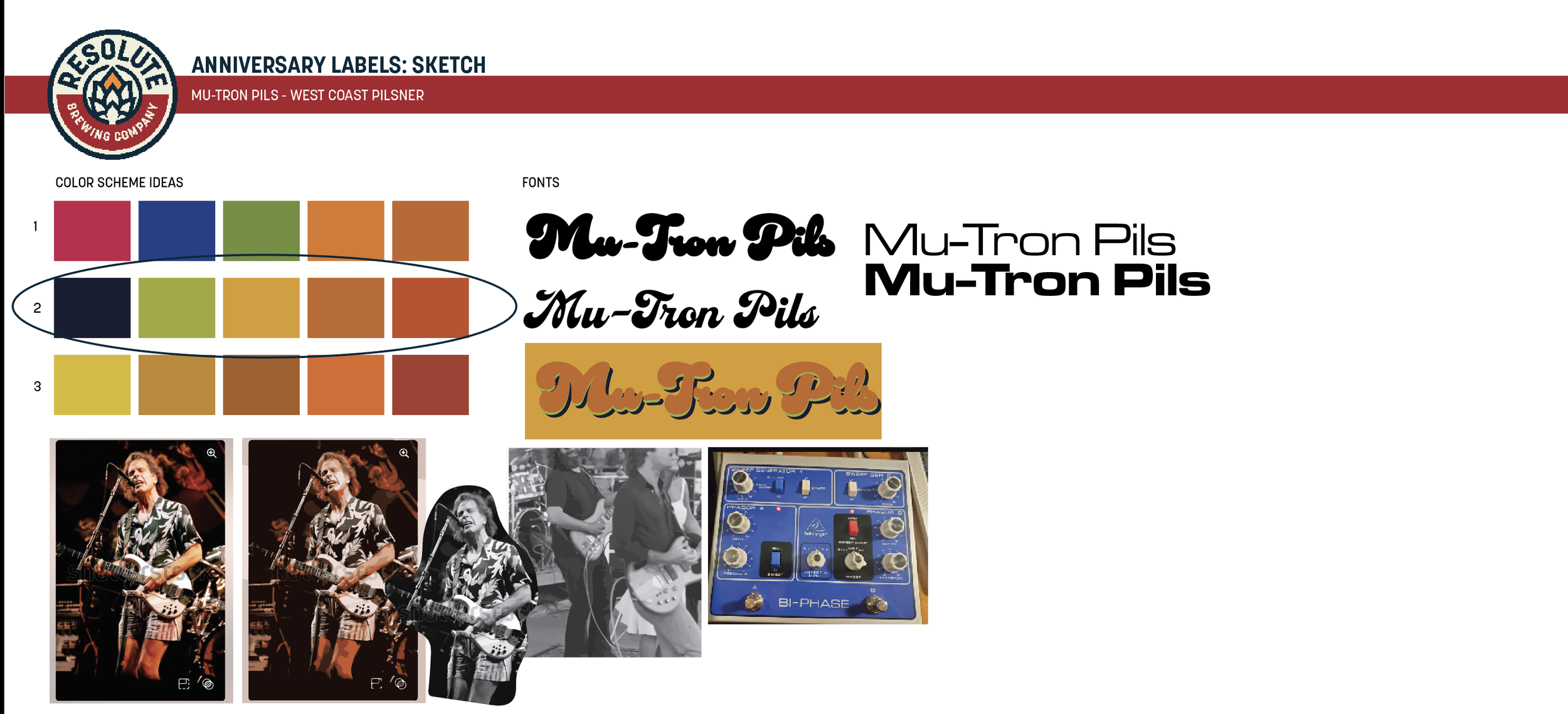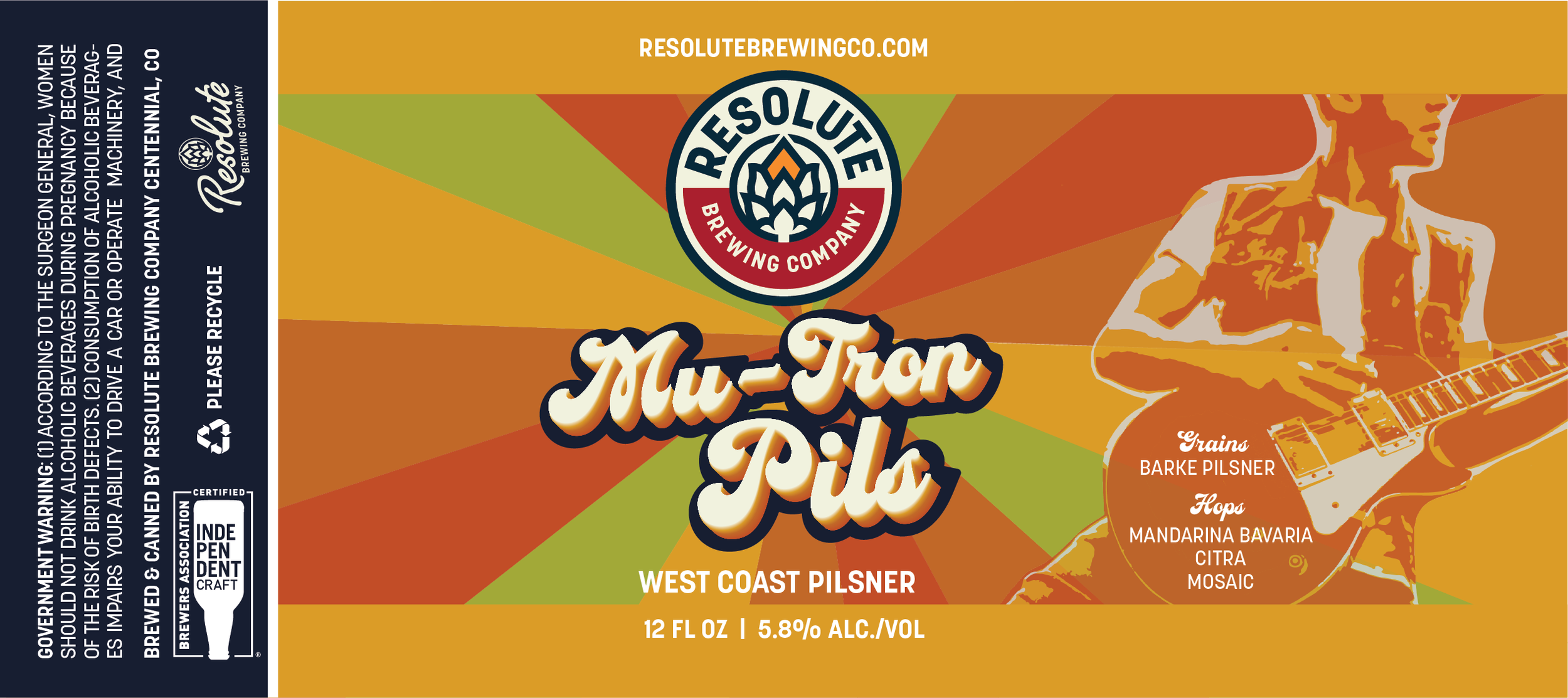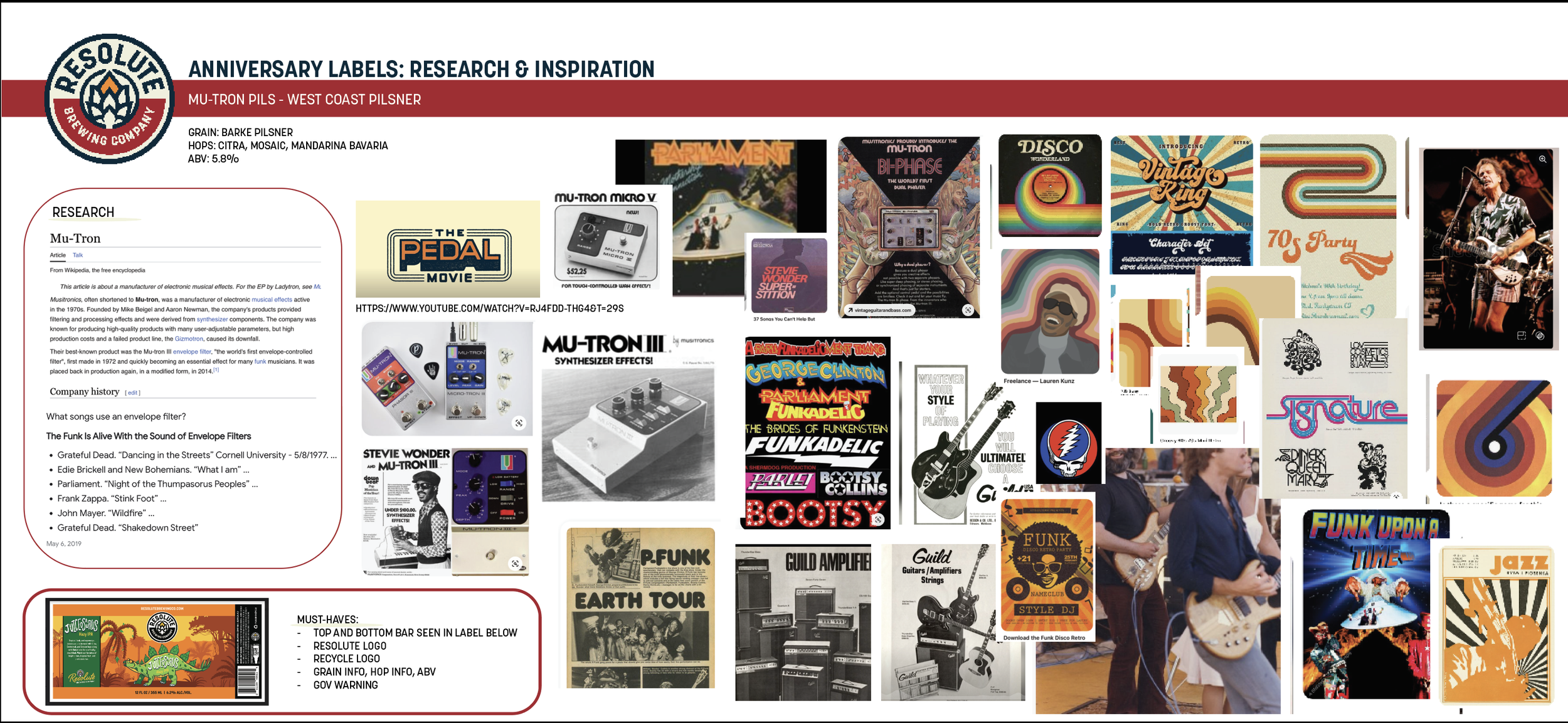 Mu-Tron: a brand of electronic musical effects and synthesizers created by Musitronics, a company founded in the 1970s that create a “spacey” sound. For Resolute’s 7th birthday, they needed a one-off label for their West Coast Pilsner. Inspired by 70s funk, I utilized Adobe Illustrator and Photoshop to design a bright and groovy 12oz label.
