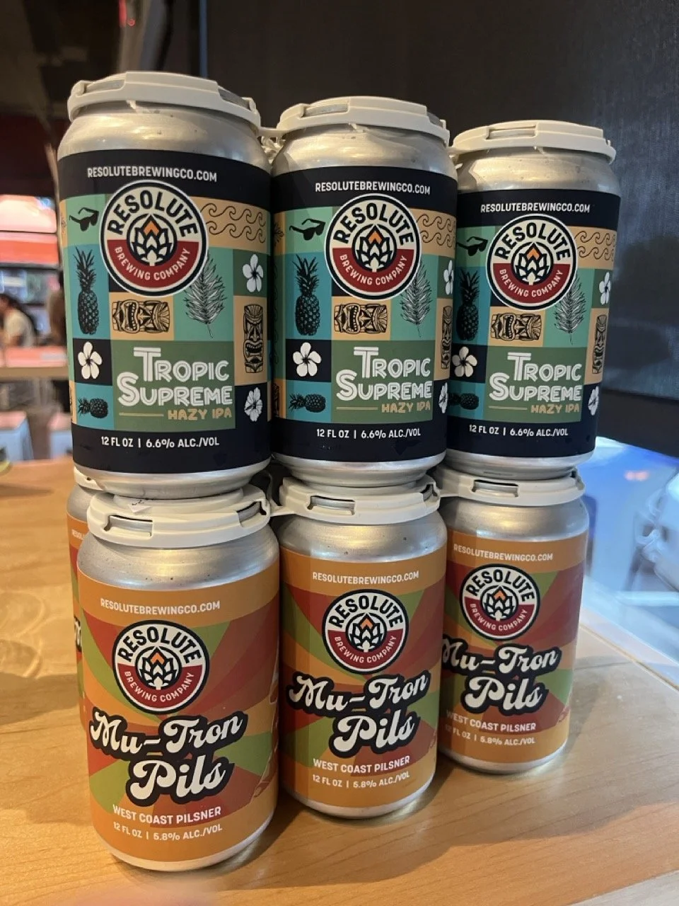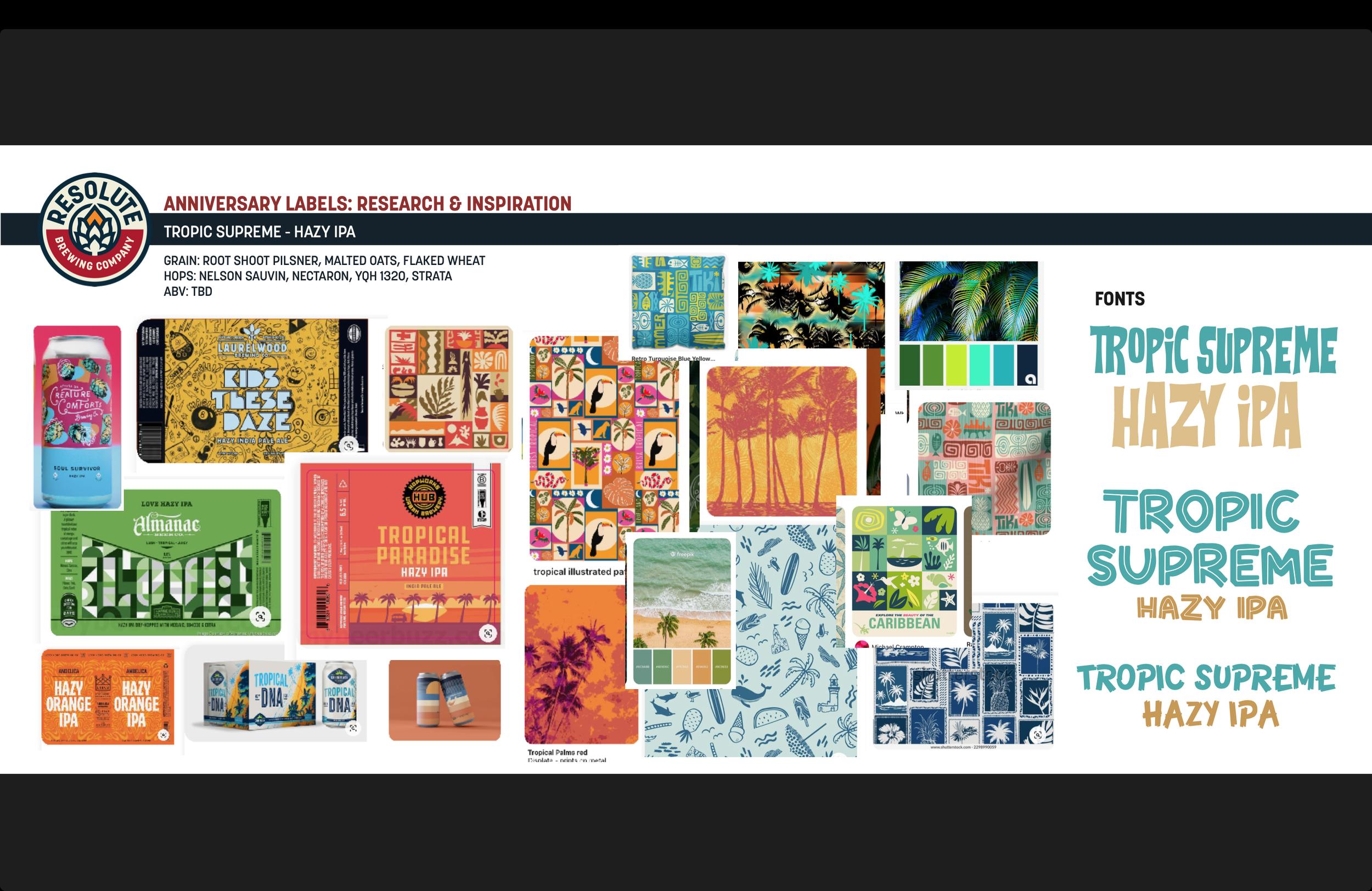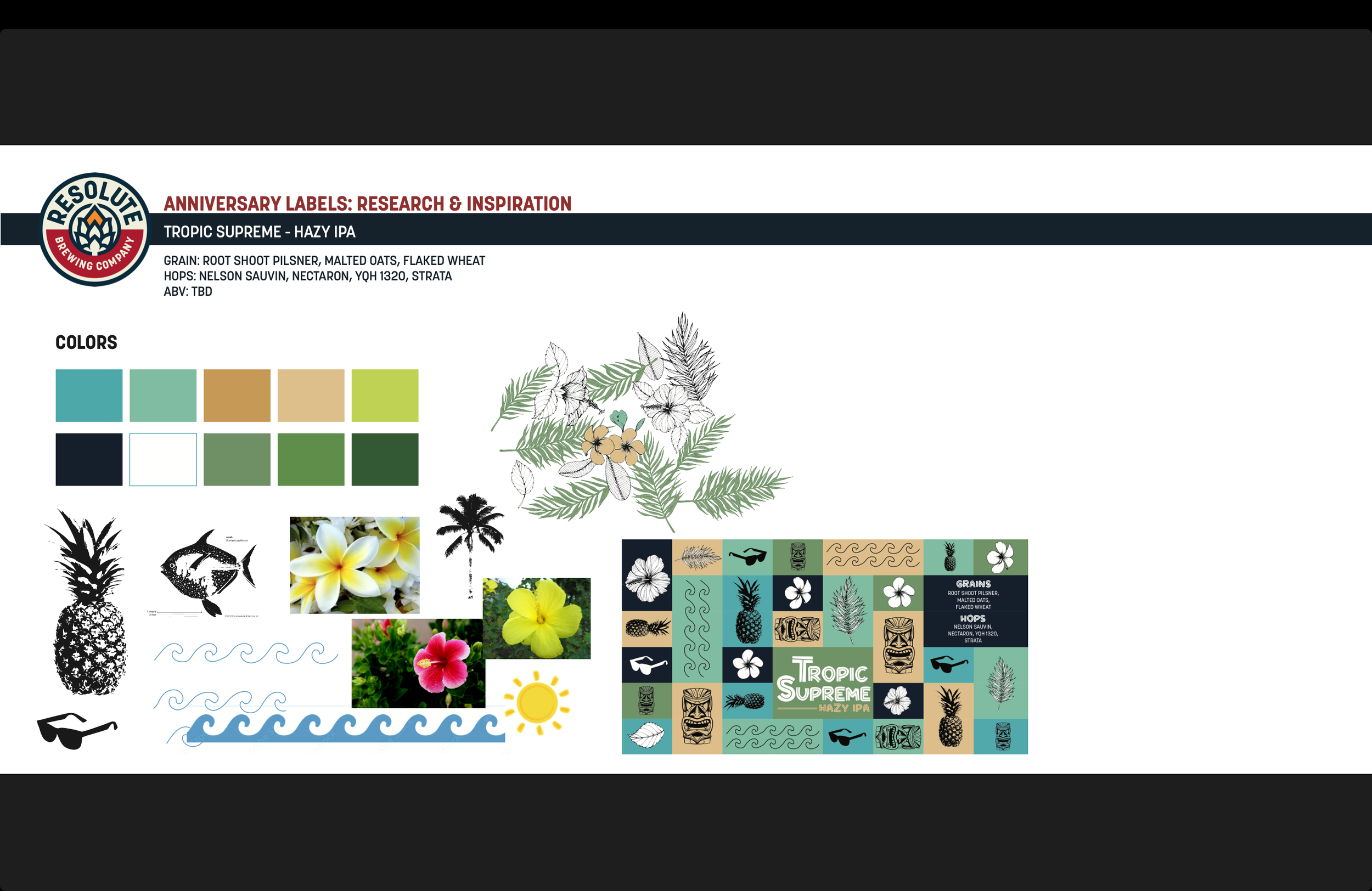 Resolute Brewing’s Head Brewer might be obsessed with Hawaiian shirts and tiki. The tropics inspired his seasonal Hazy IPA, and he needed a label that would celebrate that. Inspired by tropical paradise and Hawaiian iconography, I utilized stock vector images and an ocean color palette to design Tropic Supreme. This label remained consistent with Resolute’s brand standards by placing their circle logo front and center, and incorporating a solid line on the top and bottom of the design. There was no need for a barcode as the 12oz 6-packs were available to-go only in their two taprooms.